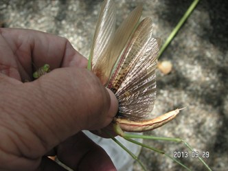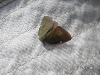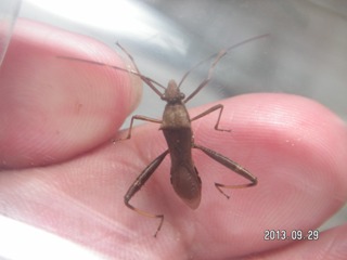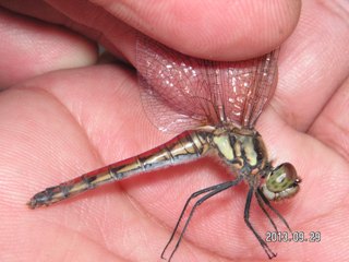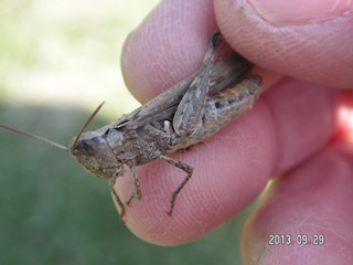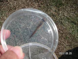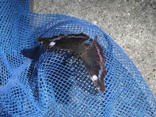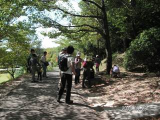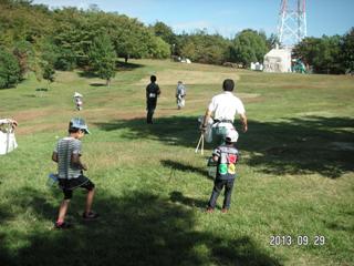 晴れて絶好の観察日和になりました。市職員の挨拶、指導員の自己紹介の後、担当の村瀬さんがコース説明を行い、注意事項を話しました。管理事務所前から芝生広場に移動して生き物観察を始めました。昆虫ではバッタ、コオロギ、キリギリスやシジミチョウの仲間がたくさん見つかり、捕らえにくいウスバキトンボを夢中になって追いかけました。広場観察後、広場北の園路を歩きながら、付近の茂みや草むらの生き物を観察しました。園路沿いは虫が少なく秋の虫の代表アカトンボもほとんど見られずがっかりでした。しかし帽子や網にとまる人懐っこいルリタテハに心が和みました。10:50に観察を終了し、事務所前に戻りました。村瀬さんが、今回見つかった生き物の分かち合いをして11:20に観察会を終了しました。(記・平松俊 )