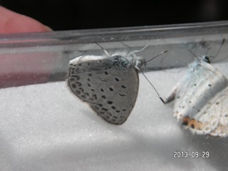 【左】園路付近を観察しています 【右】ヤマトシジミ、ツバメシジミ(ツバメシジミは後ろ羽裏の橙色斑ガ目立)