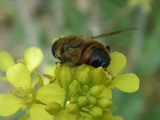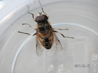 【右】シマハナアブ(ハナアブに似ていますが胸に縞があります)