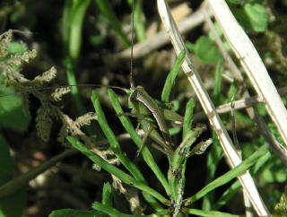 【左】キリギリス幼虫(背中両側が黒っぽいのがキリギリス幼虫、真ん中が茶っぽいのがヤブキリ幼虫です)