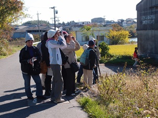 【左】「ツグミがいる」の声に一斉に見る 【右】二日後はカエルが…(11/28 撮影)