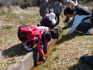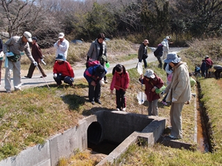 まず名鉄ガードをくぐって線路南へ。ウグイスがすぐ近くで鳴いている。道端にはホトケノザが群生。花びらを摘んで蜜を吸う子、拡大鏡で花の模様を観察する子、水路でオタマジャクシを見つけ思わずはしゃぐ子。それぞれが自然の営みに興味を沸き立たせている。つぼみオオバコがけっこう勢力を伸ばしている。今度は南知多道路をくぐって西側へ。アシタバが元気で、クズやイタドリも新芽を伸ばし始めている。バッタの子どもがピョンピョン飛び、チョウも舞出して子どもらのタモ網が盛んに振られる。何とも頼もしい。