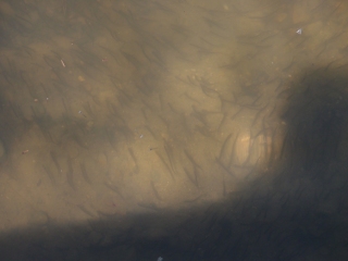 最後にシラハエの稚魚がいたという池の縁を観察。遊歩桟橋から覗くとおびただしい数の集団が泳いでいるのが見えた。我々としては初めての発見でした。