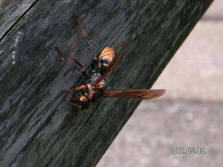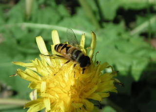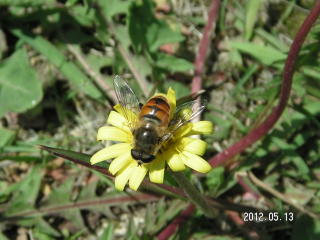 【左】シマハナアブ(背中に白っぽい横じまがあります)    【中】ホシメハナアブ?(まだら模様の複眼に特徴があります)    【右】セグロアシナガバチ