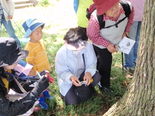 ハナアブ、ベニシジミ、モンキチョウなどが飛び交いフィールドが賑やかに。太いサクラの幹に、黒い体に赤色帯と白斑点がある何やらあやしい虫が集団でいる。ヨコズナサシガメだ。刺すと聞いてみんなおそれながらもじっと見る。