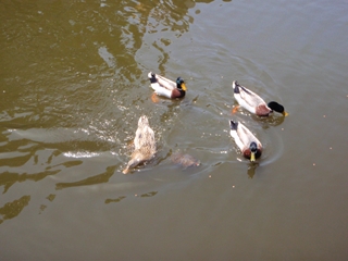 【左】始めのお話  【右】水上桟橋からの“えさ”に集まるマガモとアカミミガメ