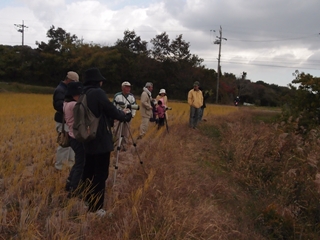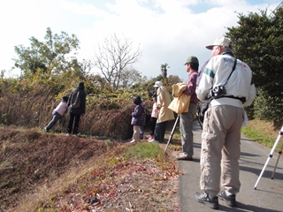 晴れて風が強くちょっと寒い日。定刻の9時半には指導員4人と一般参加者10人が集まった。行程説明と注意事項の伝達、そして指導員を紹介して出発。野外センターで今日は収穫祭の行事が行われていて、時折大きな放送の声が流れ、「鳥たち、ちゃんと現れてくれるかな」と心配。
