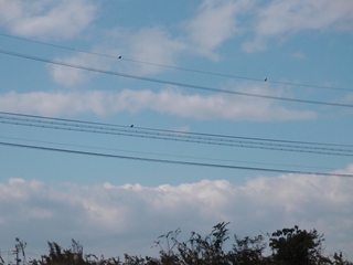 赤い葉のハゼの木に房状に実が下がり、カラスウリが赤い実をぶら下げている。そんな中ツグミがキキっと鋭く鳴いて飛び、電線に。上空をヒバリが飛んで行った。あっジョウビタキの声だ。