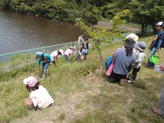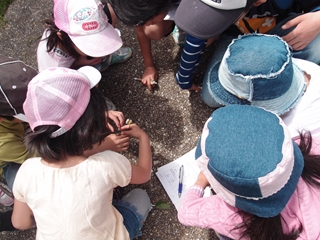 さっそくタンポポ、ヒメジョオン、ニガナ、マツバウンラン、コメツキツメクサと色とりどりの花を見つけ、香りのいいスイカズラにうっとりの笑顔。桜の幹には黒や赤のヨコヅナサシガメがいて、その不思議な形に子どもたちは大はしゃぎ。
