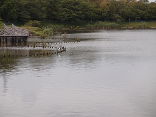 池の東へ出れば、池の端に立ち並ぶ杭にカワウが数羽羽根を休め、ダイサギもツンと立っていて見事な姿。アジサシも飛来して池の上をせわしく飛び回る。