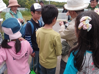 開会のあいさつに続いて、本日のコースと時間割、若干の注意事項を話し、続いて原先生がここで見られる動植物について資料を配布し説明をした。さらに今回は「草地と水辺の探索」ということで、はじめて探索目標を9項目選び出し、それを「ビンゴ表」にまとめたビンゴを作成、そのビンゴに挑戦することで一層興味を引いた観察会になることを期待して進めた。