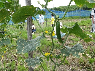 【左】無農薬の畑で観察始め 【右】キウリも何か虫が食べたみたい