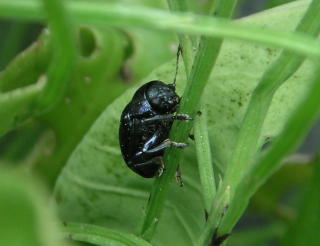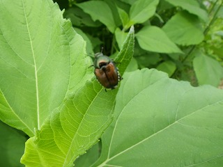 【右】イモサルハムシ(成虫はサツマイモ、ヒルガオなどの葉を食べ、幼虫はサツマイモなどの根を食べるそうです)