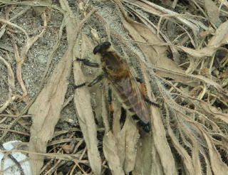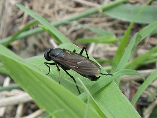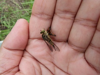 【右】シオヤアブ(ハエ、トンボからコガネムシまで捕らえて体液を吸う恐ろしいハンターです)