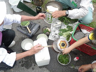 【左】ここは虫が少ないみたいです。 【右】野草試食の準備