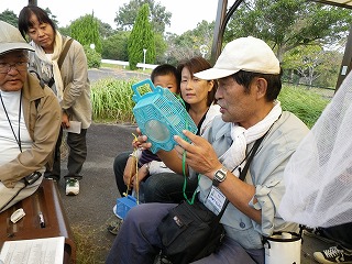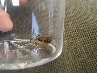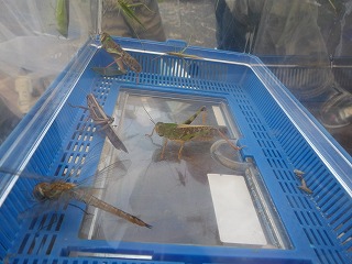 【左】採集したバッタ類の分かち合い1 【中】採集したバッタ類の分かち合い2 【右】採集したバッタ類の分かち合い3