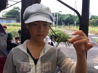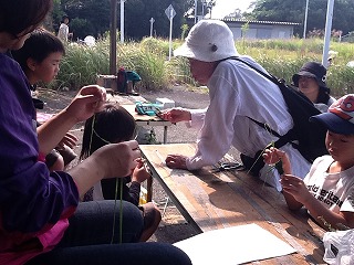 【左】ススキ・バッタ作品 【中】ススキ・バッタ作り指導1 【右】ススキ・バッタ作り指導2