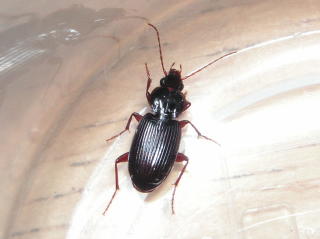 【左】ツヤヒラタゴミムシ類?(室内プール場の付近にいました) 【右】ナガゴミムシ類?(室内プール場の付近にいました)