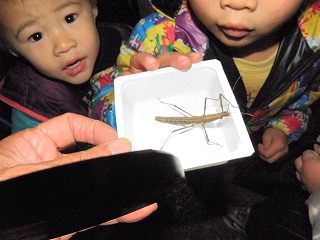 【左】トゲナナフシに代わる代わる触る子どもたち 【右】フュシャクを期待して水銀灯が灯火されました。
