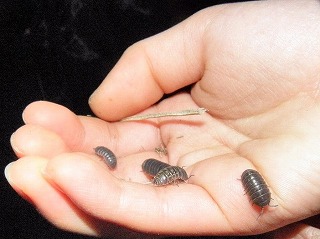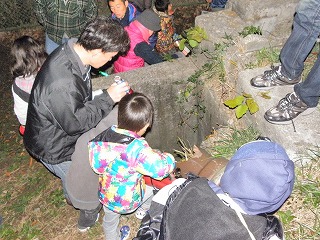 【左】子どもの3大好物のダンゴムシ 【中】湧き水の中にスジエビがいました。 【右】湧き水の中にヨシノボリもいました。