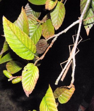 【左】ナイトハイクでたくさんの収穫がありました。 【右】ヤシャブシにとまっているトゲナナフシ