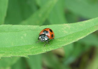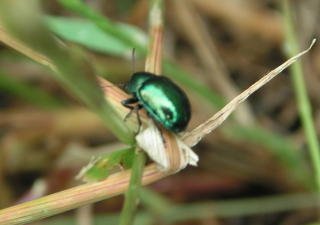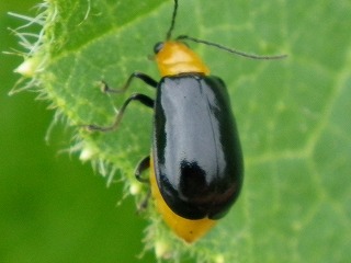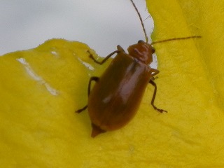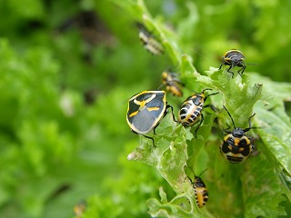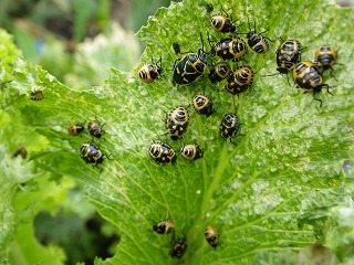 【左】ナガメ(天敵が分らない) 【中】カボチャの花に沢山いたウリハムシ(ウリ科の葉を食べる) 【右】クロウリハムシ(ウリの他、ダイズ、エノキなども食べる)