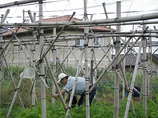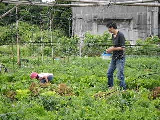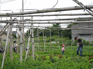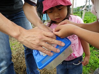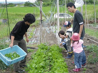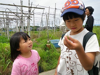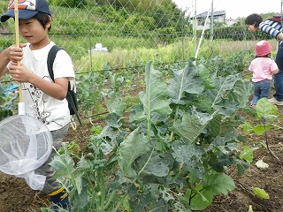 【左】モンシロチョウ採集 【中】収穫途中で虫解説 【右】トノサマバッタ採集