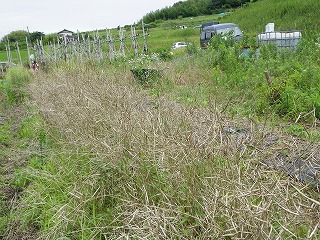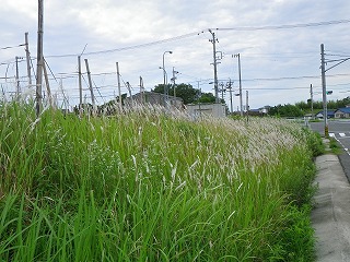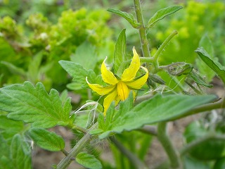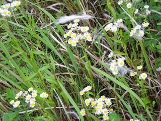 【左】周辺はチガヤが群生 【中】チガヤの中にヒメジョオンも混生 【右】トマトの花