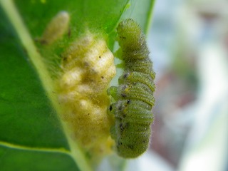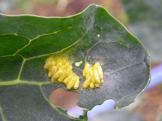 【左】コマユバチの繭 【中】青虫(コマユバチが寄生します) 【右】ナガメの群れ(アブラナの仲間を食べる)