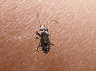 【左】バッタ類幼虫 【中】子どもの腕にとまった2mmサイズのカメムシの仲間 (?) 【右】マルガタゴミムシ類