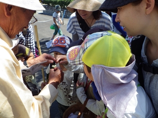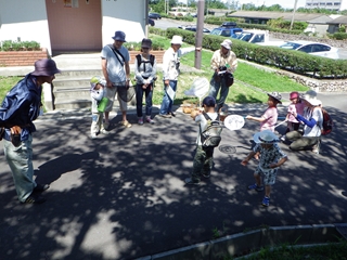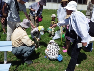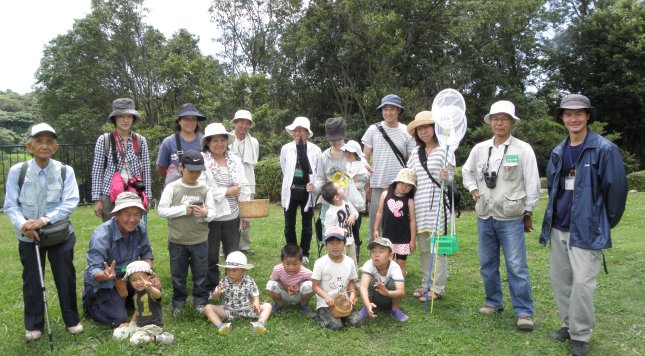 コシアキトンボ コクワガタ ノコギリカミキリ、ヨツボシケシキスイ、ナナフシ キマワリ ヤガの仲間 ゴミムシの仲間、モンキアゲハの幼虫、アオバハゴロモの幼虫、アカヒゲドクガ 、エゴノネコアシアブラムシ(参加者持参)