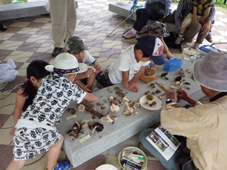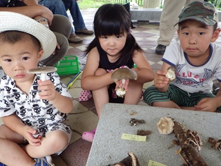 観察前にキノコの見本(カワラタケ シロキクラゲ ベニタケの仲間)を触ったり臭いを嗅いだりしました。