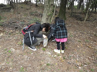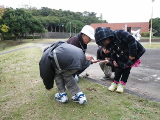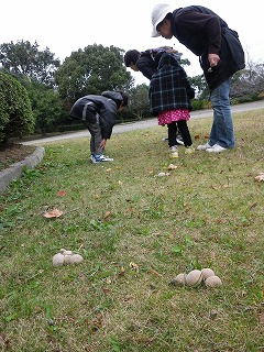 【左】ドングリ(コナラ)拾い 【中】ナンキンハゼの種子集め 【右】芝生のキノコ観察