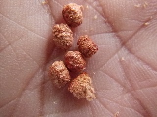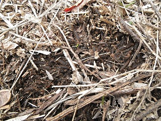 【左】ボクトウガ(木蠧蛾,ボクトウガ科)の木くず糞 【中】ボクトウガの木くず糞(拡大) 【右】幼虫群生