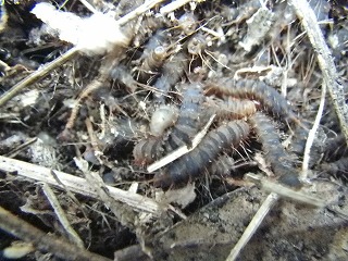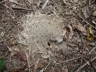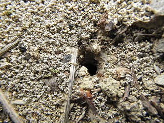 【左】ケバエの幼虫 【中】巣穴、アリさん? 【右】巣穴(拡大)