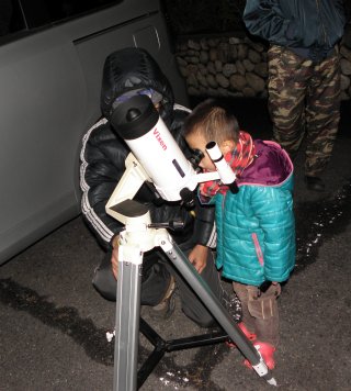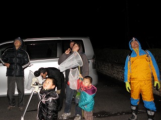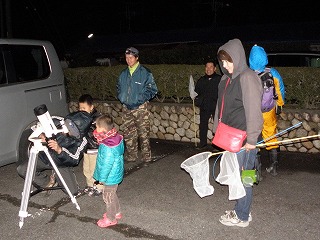 お昼まで雨が降っていたので、灯火観察も星空観察も諦めていました。開始時間には、雲が切れ、月が見え出し、星も見え始めました。簡単なお話の後、早速、開始しました。天気が心配でしたので最初に星空の観察をしました。月をまず見て次に木星を見ました。木星の衛星も良く見えました。引き続き、ナイトハイクに出掛けました。懐中電灯をつけて明かりが当たるところを観察したところ、色々な虫に出会う事が出来ました。灯火観察の水銀灯にはハエが来ただけで他の物は見られませんでした。最後にオリオン、カシオペア、北極星見て解散しました。(記・降幡 )