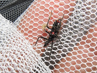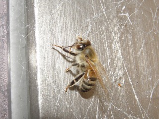 【左】写真鑑定でヨコズナサシガメ?       【中】タモでとって確認。ヨコズナサシガメ(死体)        【右】セイヨウミツバチ(死体)