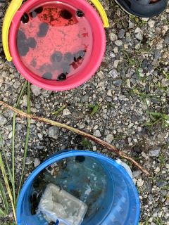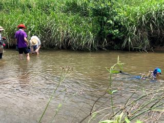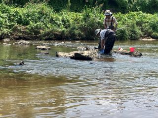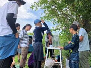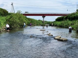 開始前の約1時間で、駐車場スペースと川へ降りるルートの草刈りをしました。体温が下がらないうちに胴長を履いたために自分が熱中症になってしまいました。開始の挨拶で注意をするように言っておいて恥ずかしい次第です。一般参加者は少なかったけどアユや、30pくらいのウナギも捕まえることができてよかったです。捕まえそこなったけど30pくらいのナマズもじっとしていたそうです。大量に水槽掃除用にイシマキガイが採集されていました。 (記