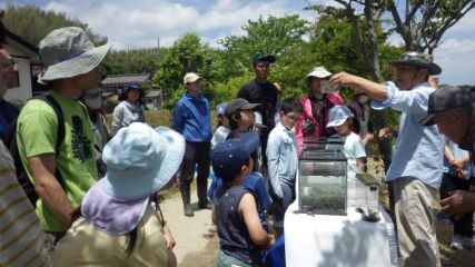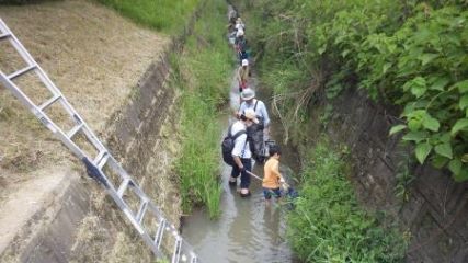 川への下降は観察会員のサポートで、脚立梯子を伝い安全に川に降りる。川に入ると参加者の皆さんは、草の茂みの等を川の生き物を居そうな所を盛んに、ジャバジャバと行動し、タモで獲物を捉えていた。何が入っているかなと、興味深々で観察し、参加者が捉えた魚等の生き物をミニ水槽に入れて観察し、指導員の田中央氏による魚類等捉えた生き物の、名前等由来の説明を受けました。今年は川底の泥が減少したようで魚の種類で例年より多く見られた。 (記:南川)