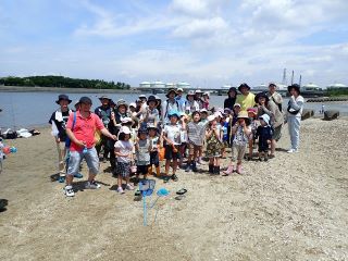 特にタコは親子ともども大反響で、参加者の親御さんからは子供にタコを描かせると真っ赤に色づけするけど、生きているタコはこんな色なんですねなど、全員が吸盤に触ったりして大騒ぎでした。  最後に、みんなで集合写真をパチッ。 (記・吉川勉)