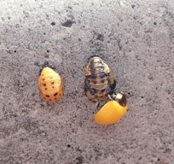 【駐車場縁石に大量にいたテントウムシのサナギと成虫】