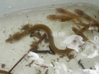 人が多いというのはすごいもので、1時間と少しの時間でたくさんの生き物が採集できた。エビしか捕れないと嘆く子供がいる一方でちゃんとウナギを捕らえている大人もいた。濁った川の水に泳ぐ魚を澄んだきれいな水の水槽に入れると、姿形がはっきりし、特徴もよくわかる。種類ごとにどんな生き物なのか、詳しい説明を聞いた。しっぽの残っている食用ガエルのオタマジャクシが採れ、みんなの視線が集まった。また、イケメン鮎くんも注目の的だった。 (記 竹内秀)