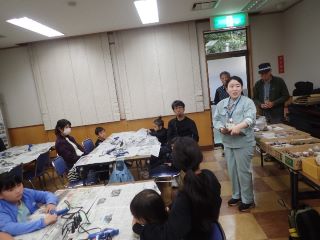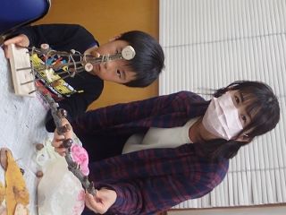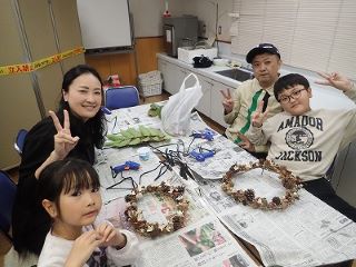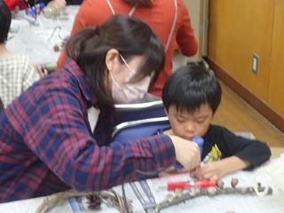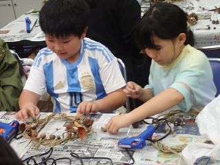 このはな館の部屋の中で、拾った落ち葉や木の実、指導員が持ってきた木の実や枝・ツルなどの材料とグルーガンを使ってそれぞれオリジナルの作品作りをした。(記・竹内秀)
