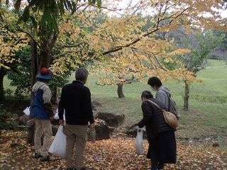 前日より雨が降りそうで降らない曇りがちの日となった。於大公園の中を1時間ほど散策して秋の宝物を探した。今年も夏が大変暑く、2週間ほど自然のサイクルが遅くなっていつまでたっても秋が感じられなかったが、やっと朝夕が冷え込むようになり、短い秋を感じた木々が急に秋の装いをし、黄色く変わった木たちの下を散歩した。大きなホオの葉やしましま模様のアラカシどんぐりを探したり、いっぱい落ちているクヌギのどんぐりをひろったりした。ハクウンボクの実を探すと、実どころか花が咲いていてびっくり。ガマズミの酸っぱい実を味わった。カツラの落ち葉はプリンのカラメルのような良い香りがして、袋に拾い集める姿も見られた。