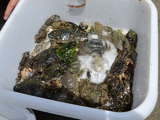 【左】採集した生き物などを観察 【右】カニがたくさん取れました