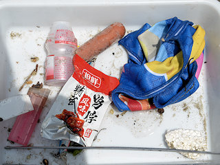 【上】漂着物は海藻のほかに、木の実、草の実、プラスチック製のものもありました