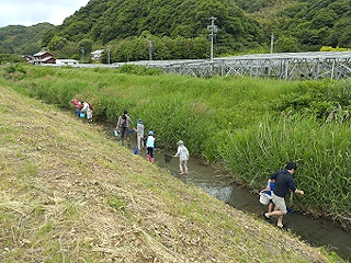 山海川本流では、一昨年の観察会では見ることができなかったヒラテテナガエビも少ないながら捕獲することができました。近年では知多半島の各河川で捕獲の相次いでいる稚アユや準絶滅危惧種のニホンイシガメも観察ができて、参加した子どもたちにとって貴重な体験になったことでしょう。(記:田中達)