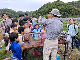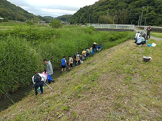 2年ぶりの開催となった山海川での観察会は、朝から雨予報でしたが観察会終了まで降らずにいてくれました。集合場所の山海ふれあい開館から徒歩で田植えの始まったばかりの田んぼ周辺の用水路で生き物を捕獲しながら山海川まで進みました。用水路ではたくさんのザリガニのほかには特定外来生物の指定されているカダヤシが多く見られました。数年前まで普通に見られたメダカが全く見ることができず時代の流れを感じます。