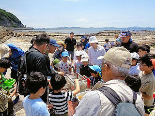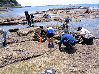 天候に恵まれましたが、とても蒸し暑い日となりました。駐車場としてお借りした県水産試験場から徒歩でまるは前の磯へ移動し、思い思いの場所で観察会を始めてもらいました。子どもたちは魚やカニなどを捕まえたりしながら、この磯で暮らす小さな生き物たちと触れ合いました。この磯ではやはりアメフラシが多く捕獲されていましたが、初めてこの磯の観察会に参加した子どもたちにとっては得体の知れない生き物なんですね。しかし、観察会についてのまとめでは、磯に住む生き物の説明や、素手で触っても大丈夫な生き物については、どんどん子どもたちに触ってもらいました。特にアメフラシは人気でした。