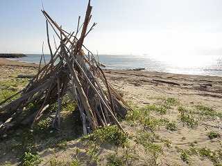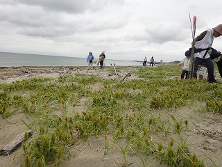 【左】流木オブジェ 【中】ハマヒルガ・コウボウムギ群落 【右】コウボウムギ群落